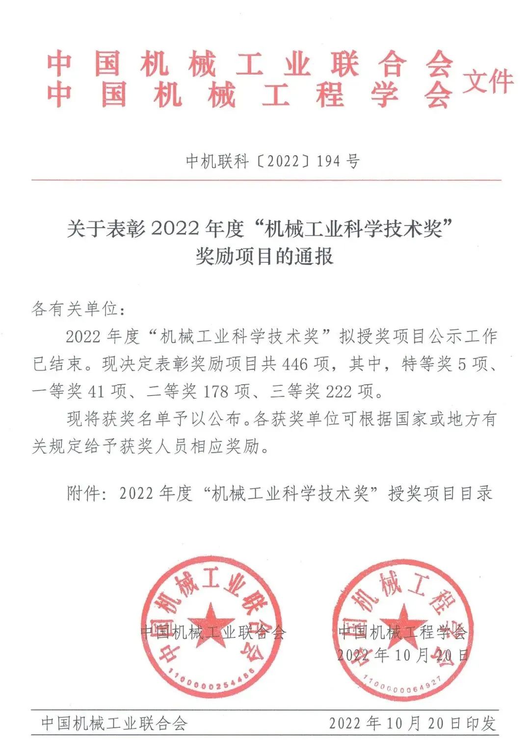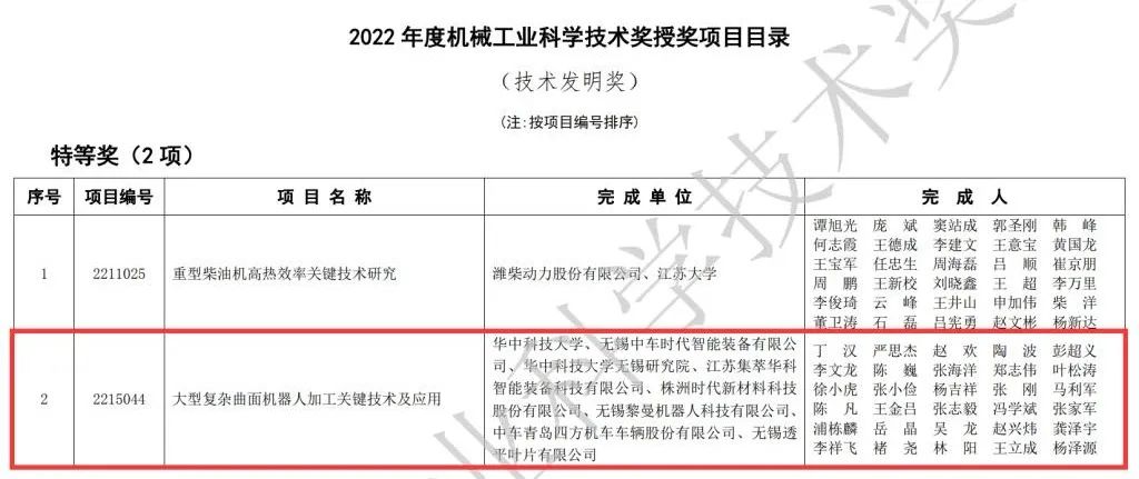 10月20日,2022年度“機械工業(yè)科學(xué)技術(shù)獎”獲獎名單公布,華中科技大學(xué)無(wú)錫研究院院長(cháng)丁漢負責的項目“大型復雜曲面機器人加工關(guān)鍵技術(shù)及應用”獲得技術(shù)發(fā)明特等獎。中國機械工業(yè)科學(xué)技術(shù)獎是由中國機械工業(yè)聯(lián)合會(huì )和中國機械工程學(xué)會(huì )共同設立并經(jīng)國家科學(xué)技術(shù)部批準,面向全國機械行業(yè)的綜合性科技獎項。本次共評出授獎項目446項,其中技術(shù)發(fā)明獎25項(含特等獎兩項,一等獎7項,二等獎11項,三等獎5項),科技進(jìn)步獎421項(含特等獎三項,一等獎34項,二等獎167項,三等獎217項)。