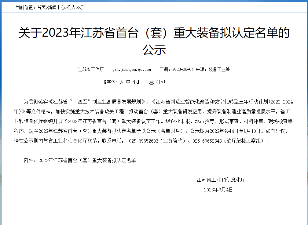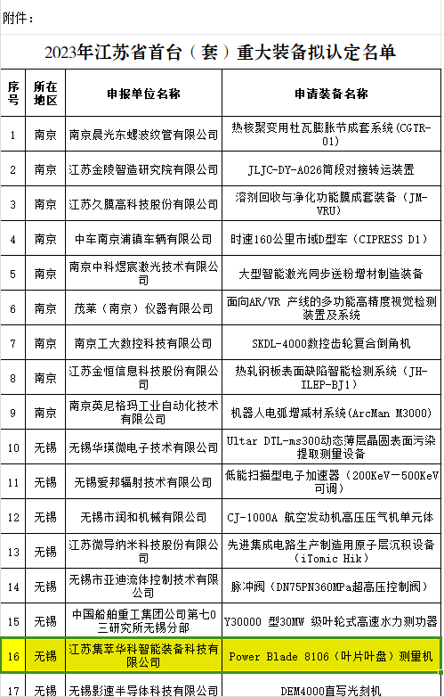 近日,江蘇省工業(yè)和信息化廳發(fā)布的《2023年江蘇省首臺(套)重大裝備擬認定名單》已完成公示,江蘇集萃華科智能裝備科技有限公司“Power Blade 8106(葉片葉盤(pán))測量機”順利入選2023年江蘇省首臺(套)重大裝備。